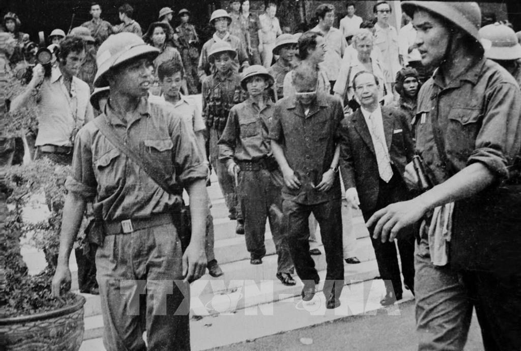 Hình ảnh Quân giải phóng dẫn giải Tổng thống Dương Văn Minh và Thủ tướng Vũ Văn Mẫu của Ngụy quyền Sài Gòn tới Đài Phát thanh để đọc lời tuyên bố đầu hàng vô điều kiện, trưa 30/4/1975, đánh dấu thắng lợi trọn vẹn của chiến dịch Hồ Chí Minh lịch sử, được phóng viên TTXVN ghi lại. Ảnh: TTXVN