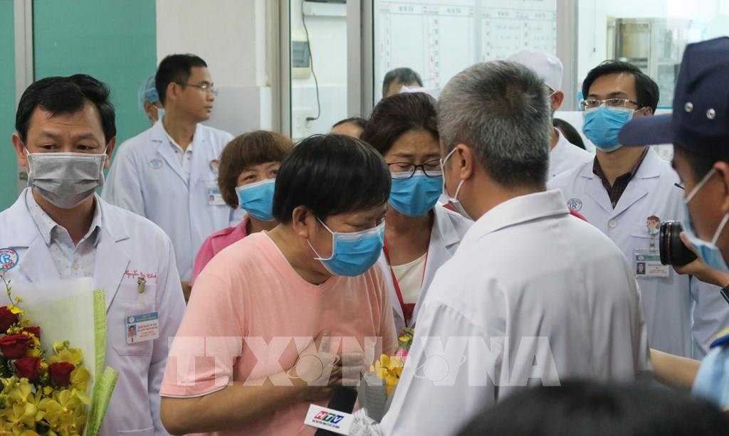 Hình ảnh bệnh nhân Li Ding (áo hồng) - một trong hai người đầu tiên nhiễm SARS-CoV-2 tại Việt Nam cúi đầu cảm ơn các bác sỹ Việt Nam trong ngày xuất viện (12/2/2020) được phóng viên TTXVN ghi lại. Ảnh: Đinh Hằng – TTXVN