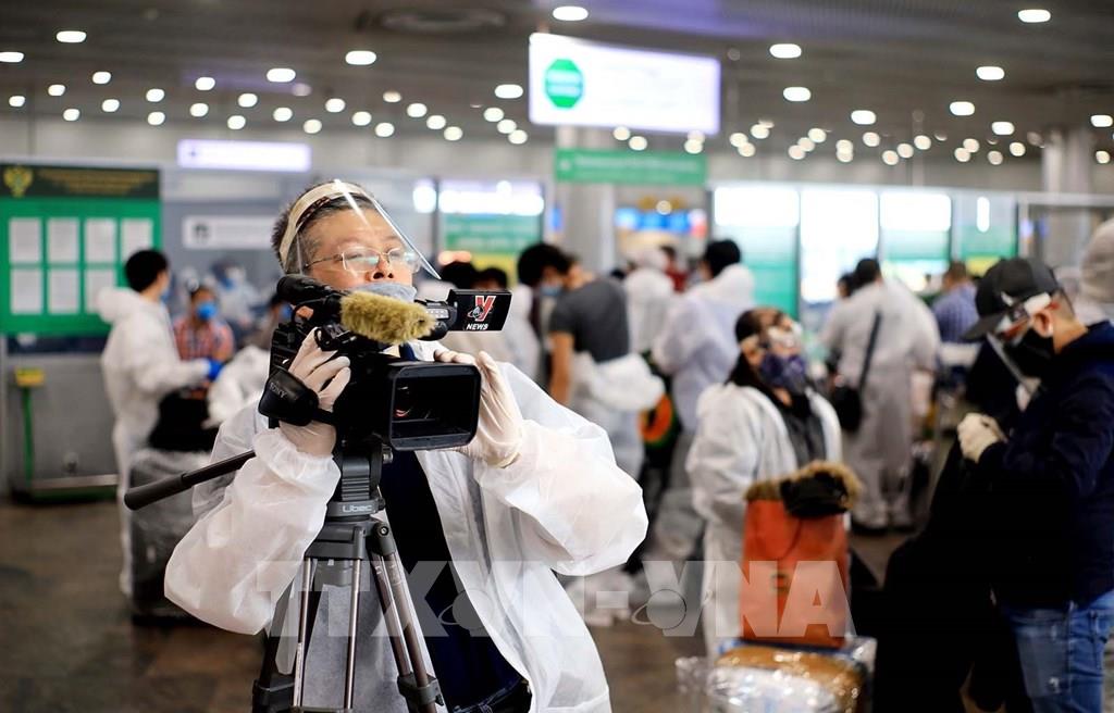Trưởng Cơ quan thường trú TTXVN tại Moskva Bùi Duy Trinh đưa tin về chuyến bay đầu tiên đưa hơn 300 công dân Việt Nam từ Liên bang Nga về nước trong bối cảnh đại dịch COVID-19, tại sân bay Sheremetyevo, tháng 5/2020. Ảnh: TTXVN