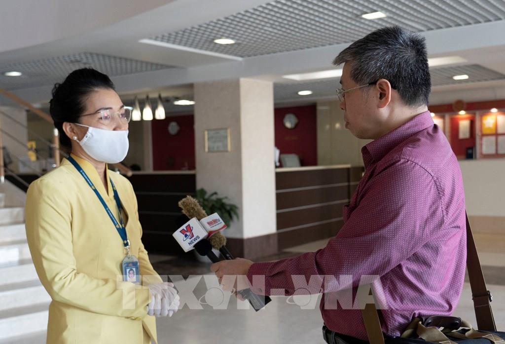 Chị Nguyễn Thị Thu Hằng, tiếp viên trưởng tổ tiếp viên Vietnam Airlines thay mặt các tiếp viên đã thể hiện tình thần quyết tâm sẵn sàng vì cộng đồng, vượt qua những khó khăn do ảnh hưởng của dịch COVID-19 để hoàn thành nhiệm vụ phục vụ hành khách thực hiện chuyến bay từ Moskva về Việt Nam (ngày 17/3/2021) đang trả lời phỏng vấn phóng viên TTXVN tại Liên bang Nga. Ảnh: TTXVN