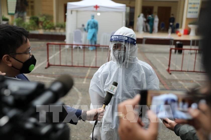Đại diện tổ công tác tại trạm test nhanh COVID-19 điểm trường THCS Đống Đa (Hà Nội) trả lời phỏng vấn báo chí, sáng 31/3/2020. Ảnh: Thanh Tùng - TTXVN
