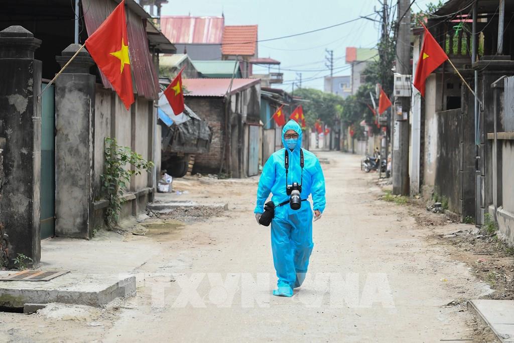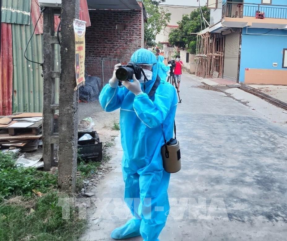 Phóng viên Thành Đạt - TTXVN tác nghiệp tại vùng dịch thôn Lỗ Giao, huyện Đông Anh (Hà Nội). Ảnh: TTXVN