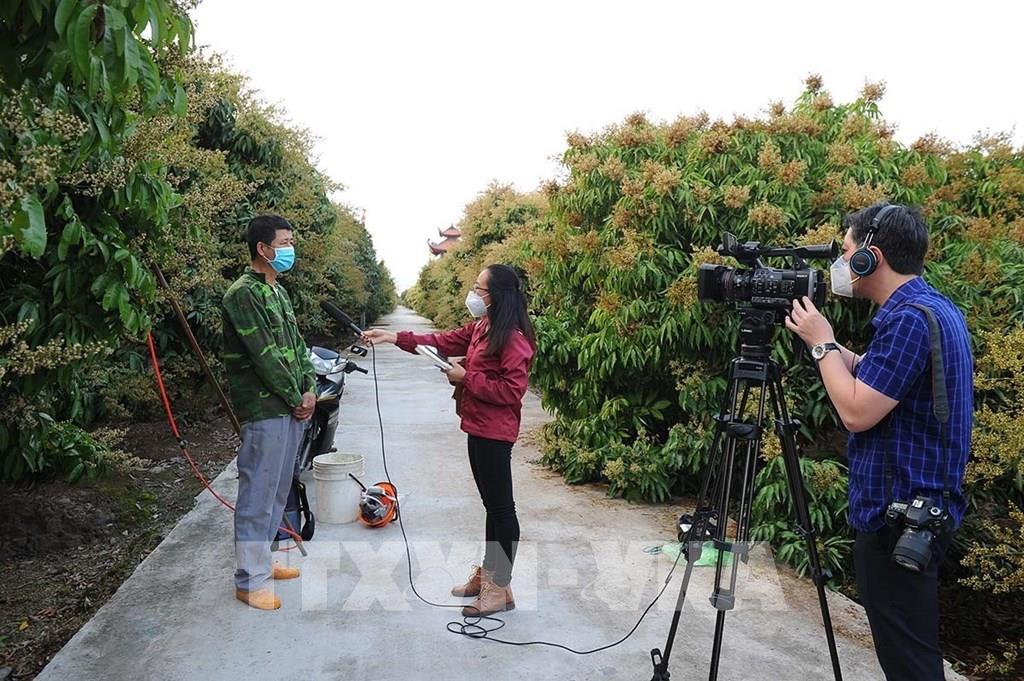 Nhóm phóng viên cơ quan thường trú TTXVN tại Hải Dương phỏng vấn người dân về tình hình sản xuất nông nghiệp trong thời gian thực hiện giãn cách xã hội, tháng 3/2021. Ảnh: TTXVN