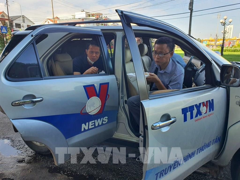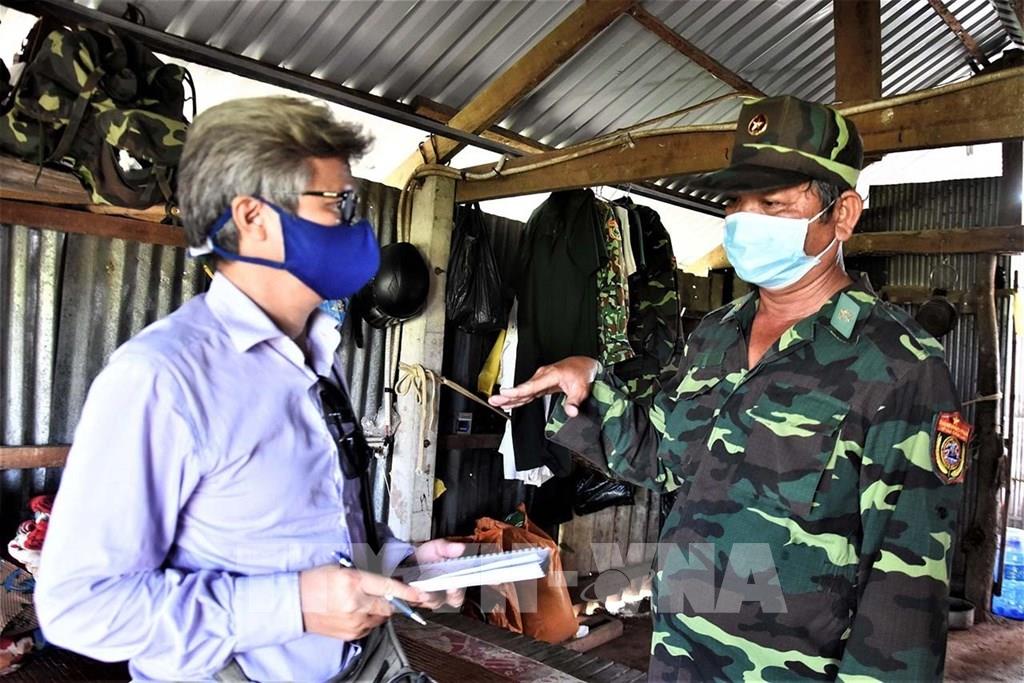 Phóng viên Nguyễn Xuân Khu, cơ quan thường trú TTXVN TP. Hồ Chí Minh phỏng vấn các chiến sỹ tăng cường cắm chốt phòng chống dịch COVID-19 tại đồn biên phòng Mỹ Quý Tây, Long An, tháng 5/2020. Ảnh: TTXVN