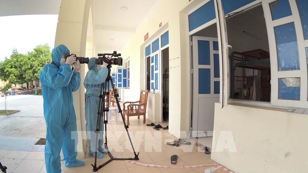 Phóng viên TTXVN tại Bắc Giang tác nghiệp trong khu cách ly trường Đại học Nông Lâm Bắc Giang. Ảnh: TTXVN