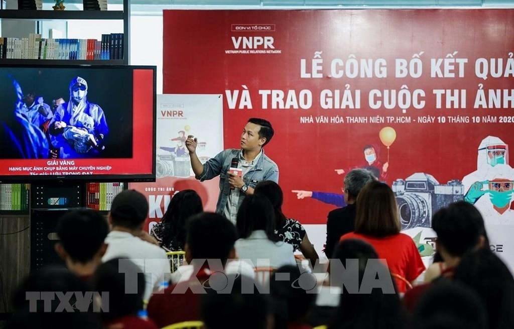 Tác giả Lưu Trọng Đạt của TTXVN giới thiệu tác phẩm đoạt giải Vàng hạng mục "Ảnh chụp bằng máy ảnh chuyên nghiệp", tại cuộc thi ảnh “Kiên cường Việt Nam". Cuộc thi do Mạng lưới Quan hệ Công chúng Việt Nam tổ chức, với mục đích lan tỏa những hình ảnh ấn tượng về dân tộc Việt Nam kiên cường trong cuộc chiến phòng, chống đại dịch COVID-19. Ảnh: TTXVN phát