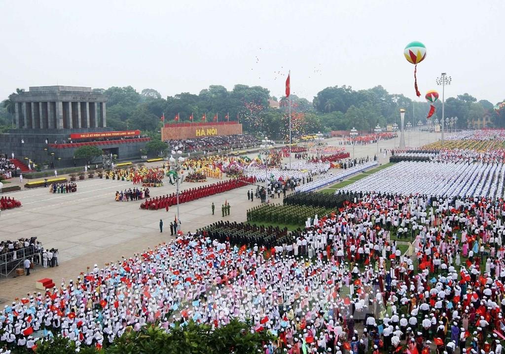 Sáng 10/10/2010, tại Quảng trường Ba Đình Hà Nội diễn ra Lễ diễu binh, diễu hành chào mừng Đại lễ kỷ niệm 1000 năm Thăng Long- Hà Nội. Ảnh: TTXVN