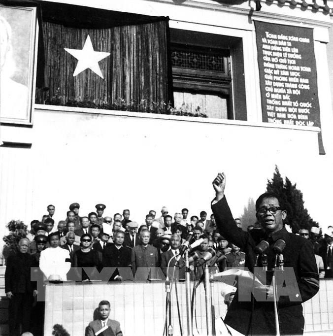 Ngày 9/9/1969, tại Lễ truy điệu trọng thể Chủ tịch Hồ Chí Minh ở Quảng trường Ba Đình lịch sử, thay mặt Ban Chấp hành Trung ương Đảng, đồng chí Bí thư thứ nhất Lê Duẩn hứa trước anh linh Người: Nén đau thương thành hành động cách mạng, anh dũng phấn đấu, hăng hái vươn lên, đạp bằng mọi trở lực, chông gai, quyết tâm đánh thắng hoàn toàn giặc Mỹ xâm lược, quyết tâm xây dựng thành công chủ nghĩa xã hội, thực hiện lời thề danh dự trong giờ phút vĩnh biệt thiêng liêng này. Ảnh: Tư liệu TTXVN