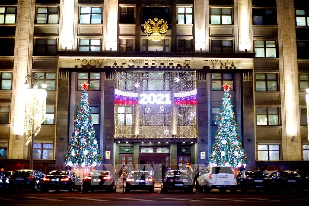 Trụ sở Duma Quốc gia Nga trang hoàng lộng lẫy đón Năm mới 2021. Ảnh: Trần Hiếu - PV TTXVN tại Nga