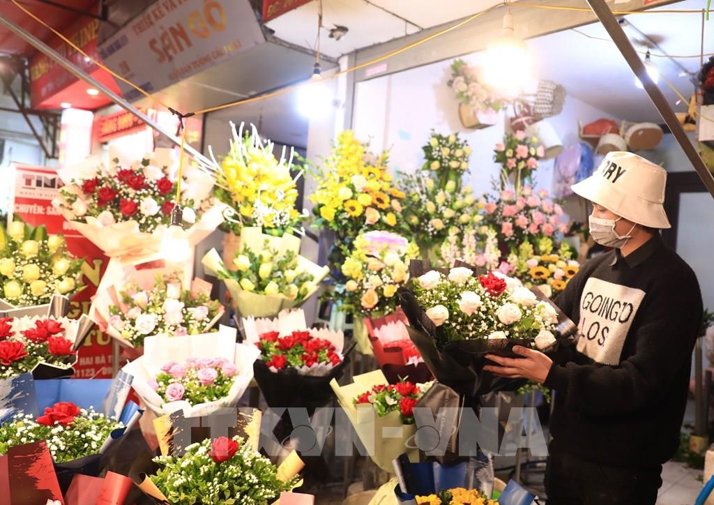 Một cửa hàng hoa trên phố Kim Ngưu với những bó hoa Hồng sẵn sàng cho khách đến mua. Ảnh: Hoàng Hiếu - TTXVN