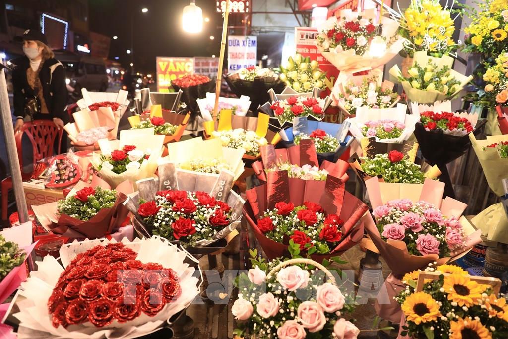 Hoa Hồng - loài hoa tượng trưng cho tình yêu được bày bán nhiều trên phố Trần Xuân Soạn tối 13/2. Ảnh: Hoàng Hiếu - TTXVN