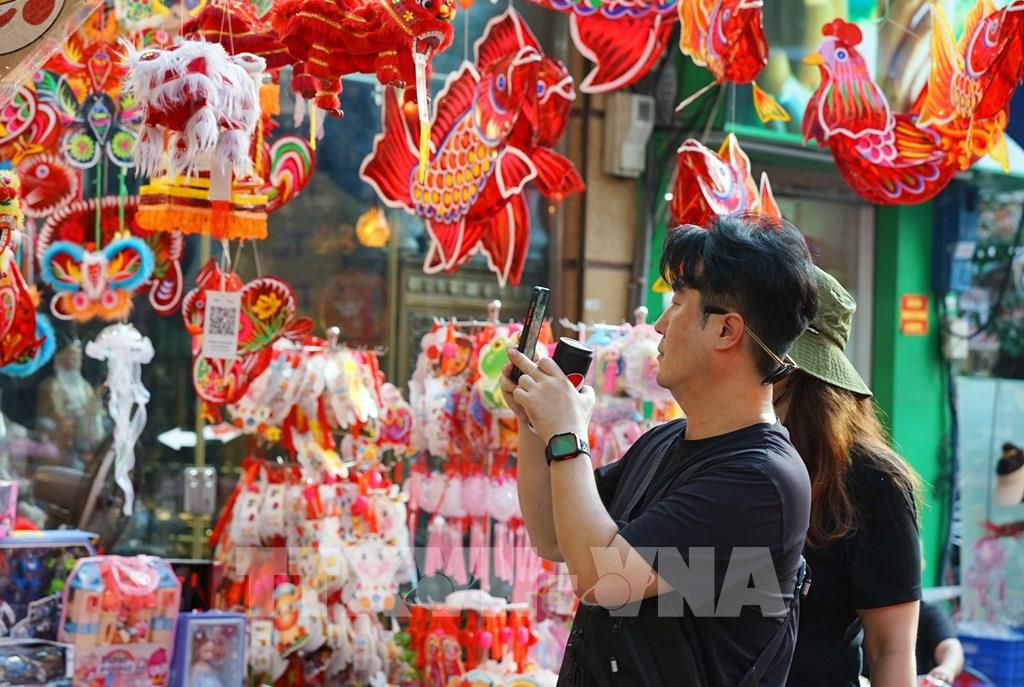 Du khách nước ngoài thích thú lưu lại hình ảnh các món đồ chơi Trung thu truyền thống trên phố Hàng Mã. Ảnh: Khánh Hòa - TTXVN