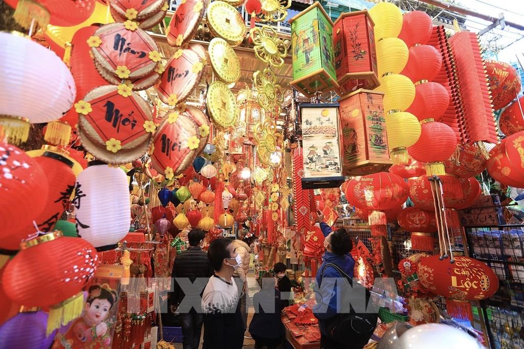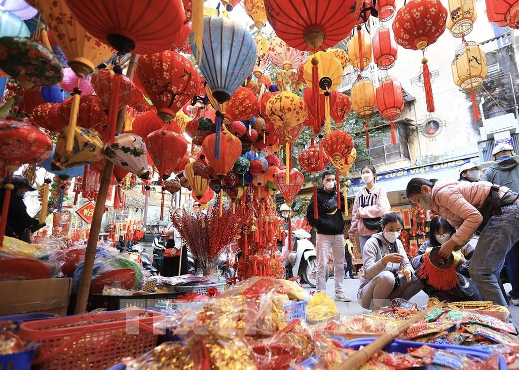 Cửa hàng đèn lồng với màu sắc rực rỡ trên phố Hàng Mã thu hút nhiều người đến mua sắm đón Tết. Ảnh: Hoàng Hiếu - TTXVN