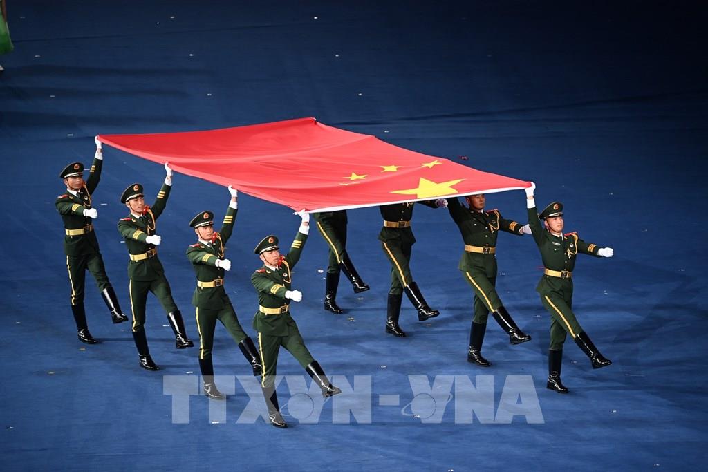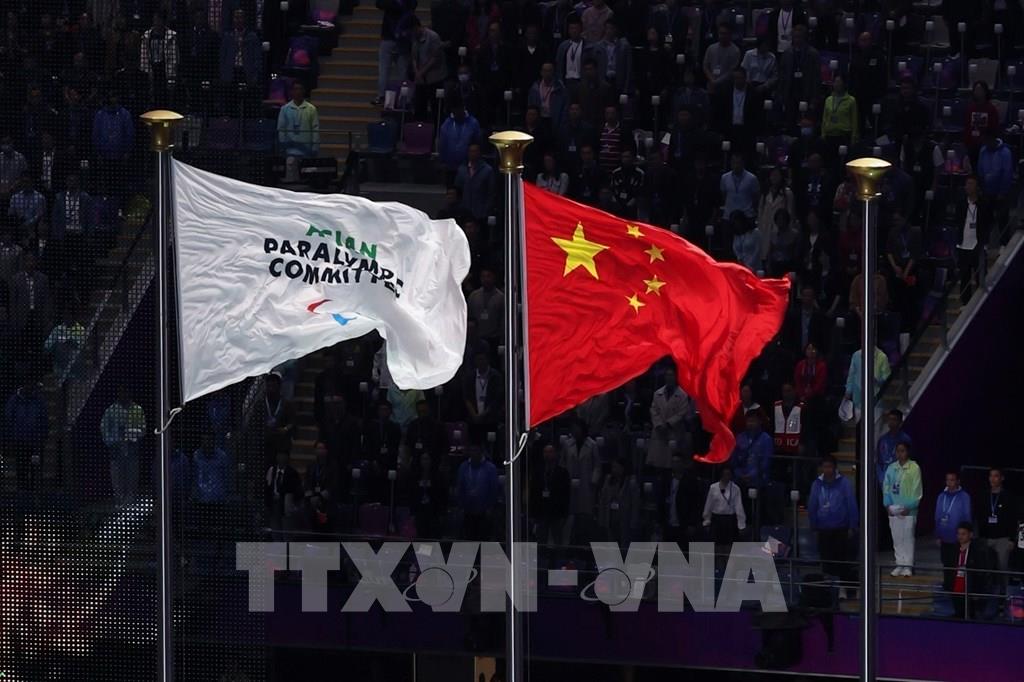 Cờ Trung Quốc và cờ của Ủy ban Paralympic châu Á tại lễ khai mạc Asian Para Games lần thứ 4 ở Hàng Châu, tỉnh Chiết Giang, Trung Quốc, ngày 22/10/2023. Ảnh: THX/TTXVN