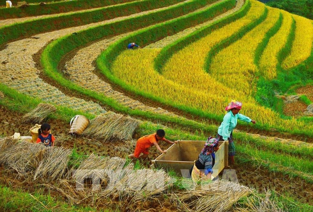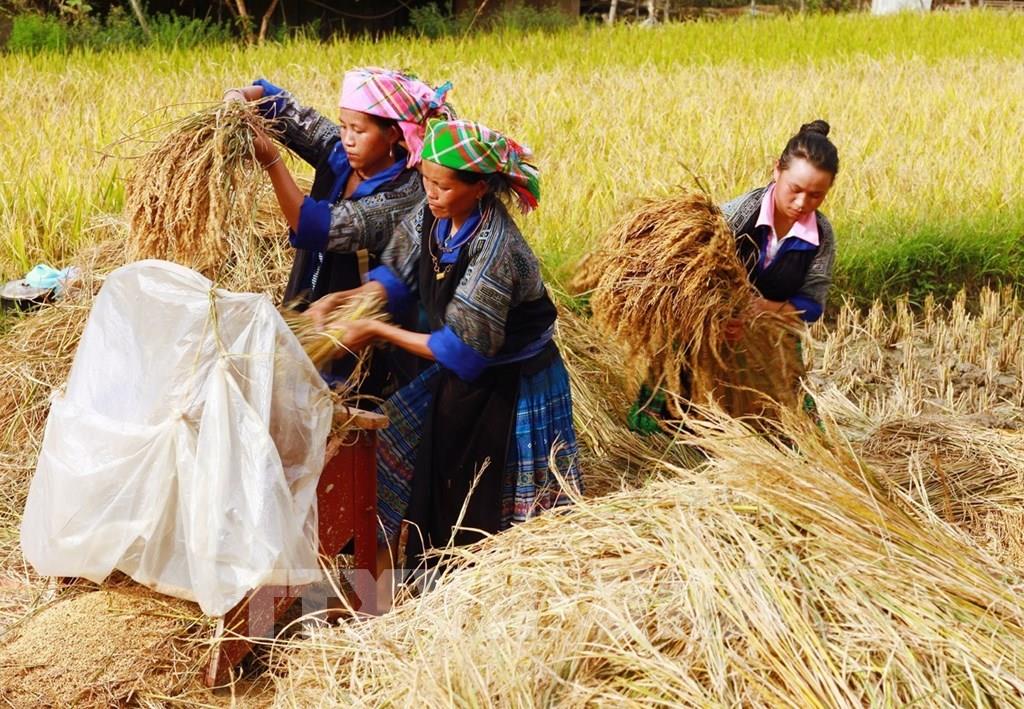 Người dân bản Lìm Mông vui tươi thu hoạch vụ lúa mới. Ảnh: Lâm Khánh – TTXVN
