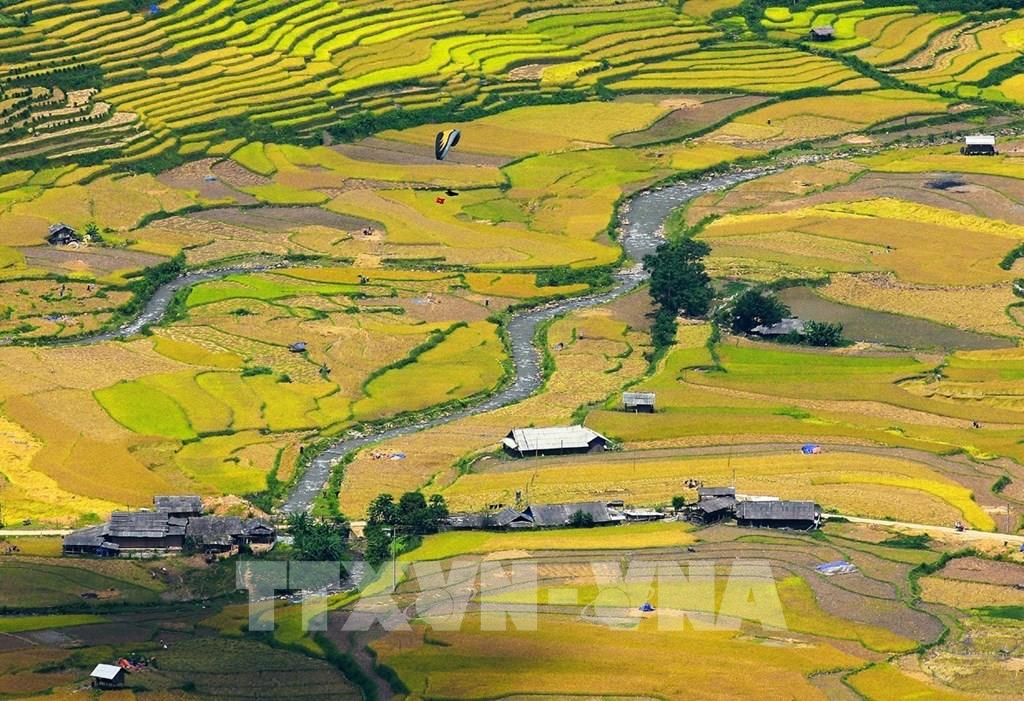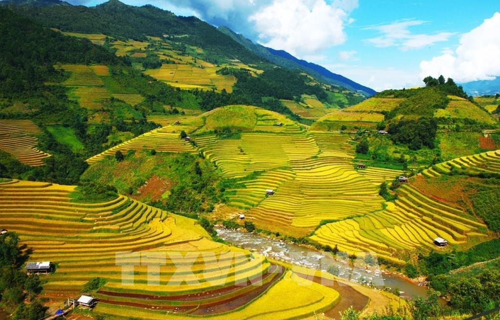 Từ trên đỉnh đèo Khau Phạ, du khách được ngắm nhìn vẻ đẹp bao quát nhất của các song ruộng chín vàng. Ảnh: Lâm Khánh – TTXVN