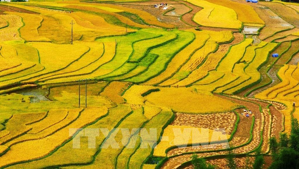Những thửa rộng bậc thang ánh sắc vàng trong nắng chiều. Ảnh: Lâm Khánh – TTXVN