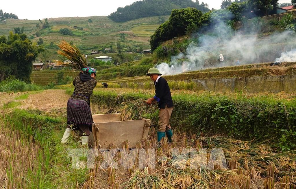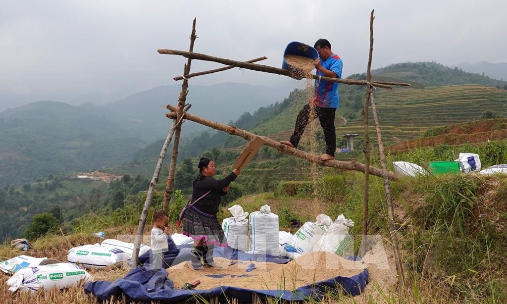 Trên những thửa ruộng bậc thang Mù Cang Chải, lúa chín vàng rộ khắp các cánh đồng, người nông dân đã tiến hành thu hoạch. Ảnh: Tuấn Anh - TTXVN