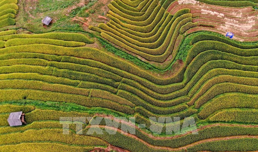 Những thửa ruộng uốn lượn mềm mại và tinh tế thành hình bán nguyệt như những cô nàng xinh đẹp đang vào mùa chín. Ảnh: Tuấn Anh - TTXVN