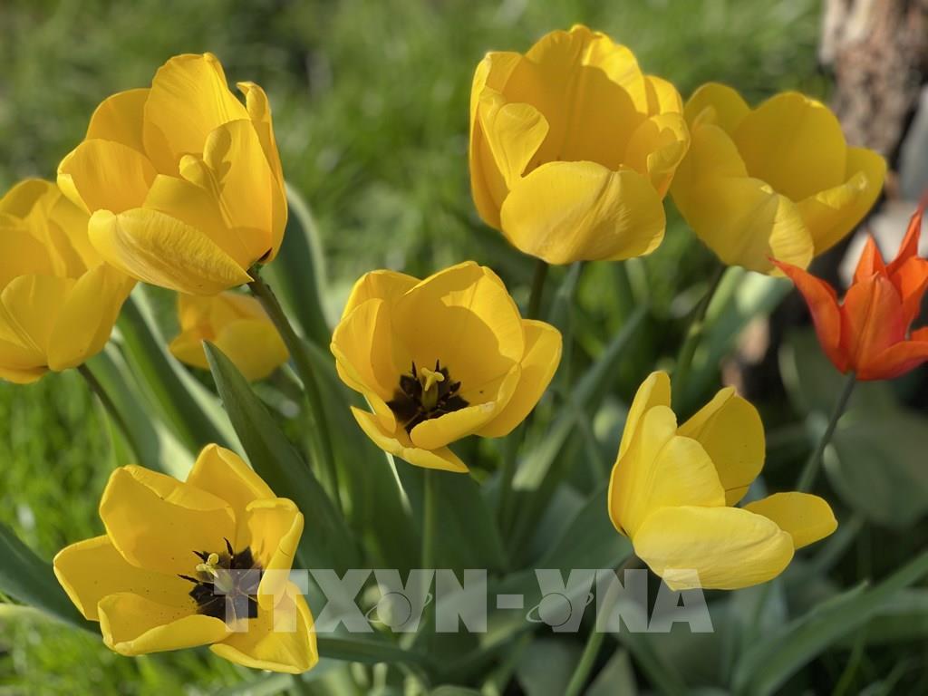 Tuylip vàng trồng thành từng khóm nhỏ trên thảm cỏ xanh trong công viên Regent’s. Ảnh: Minh Hợp - PV TTXVN
