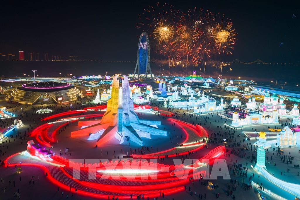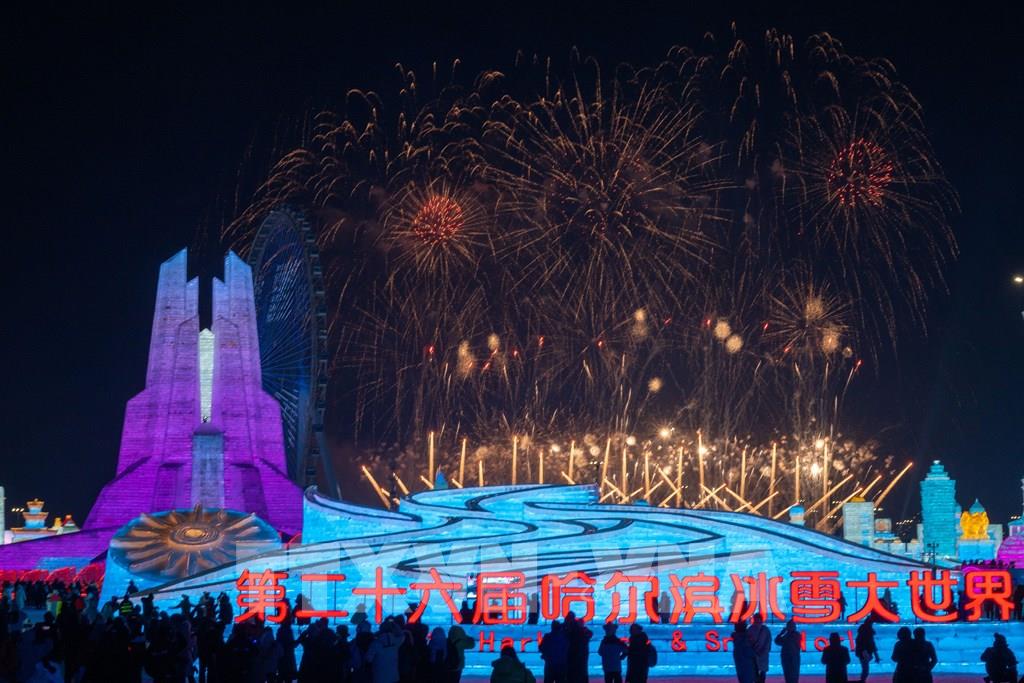 Trình diễn pháo hoa tại Lễ hội băng đăng quốc tế Cáp Nhĩ Tân, Trung Quốc, ngày 5/1/2025. Ảnh: THX/TTXVN