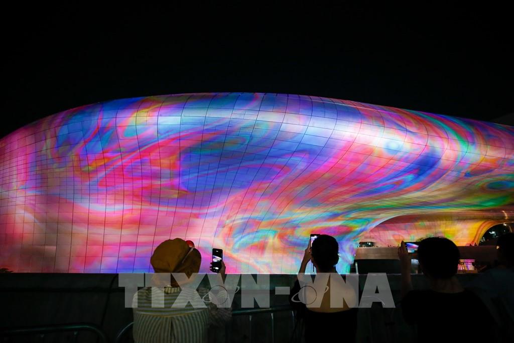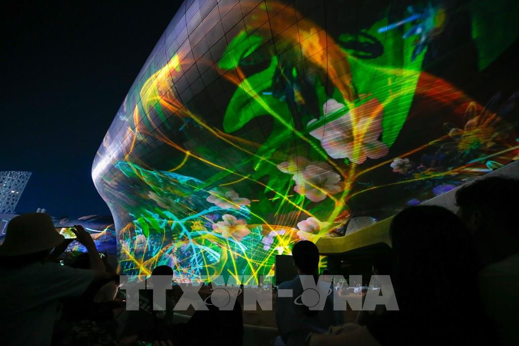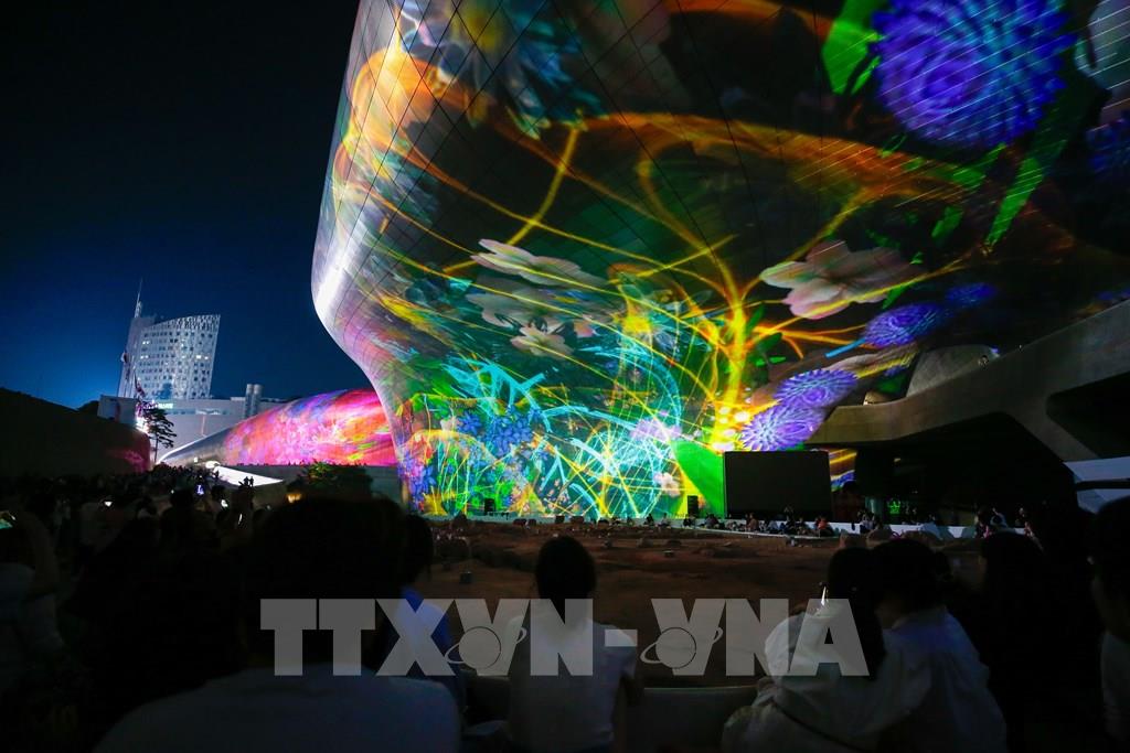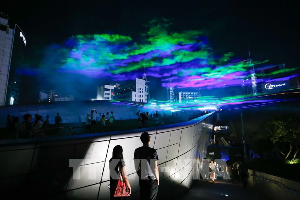 Người dân chiêm ngưỡng tác phẩm nghệ thuật tại triển lãm ánh sáng ở Seoul, Hàn Quốc, ngày 1/9/2023. Ảnh: THX/TTXVN