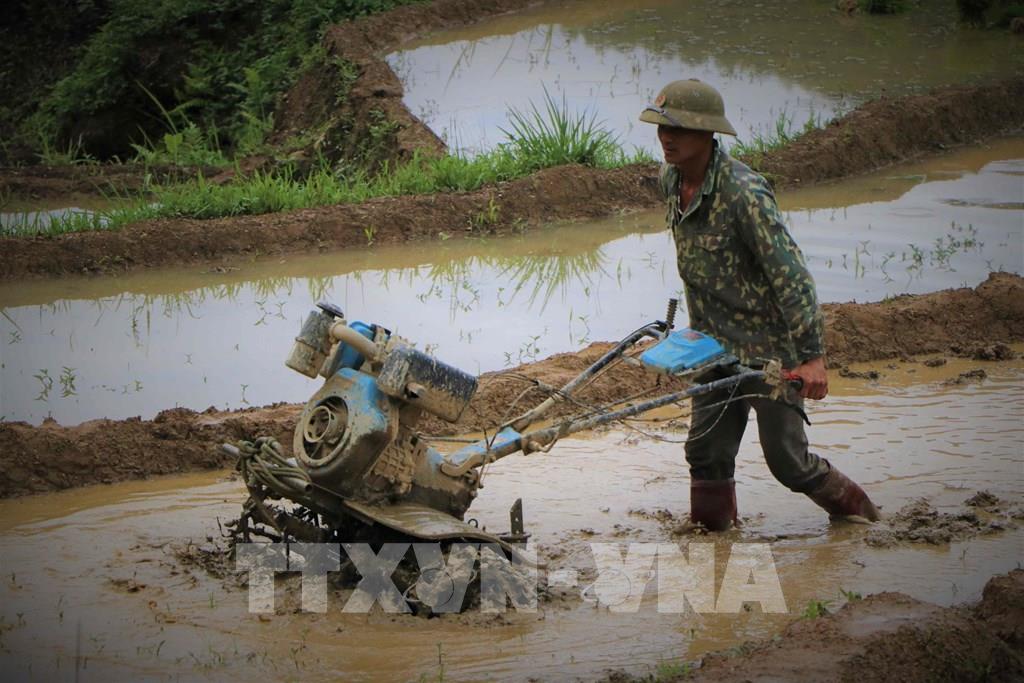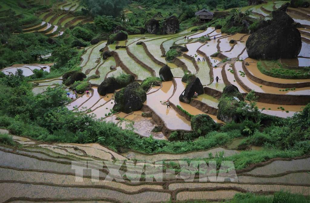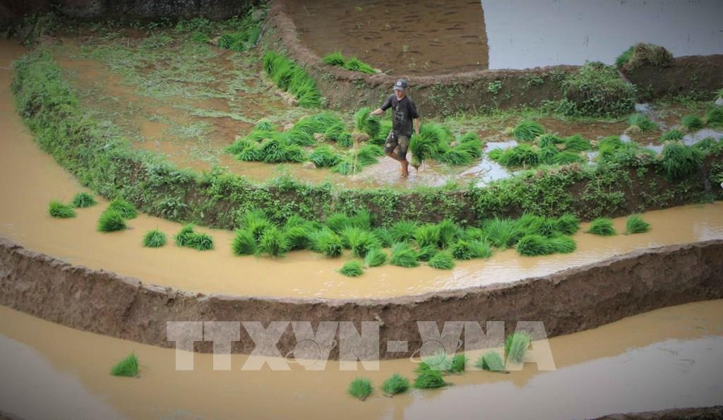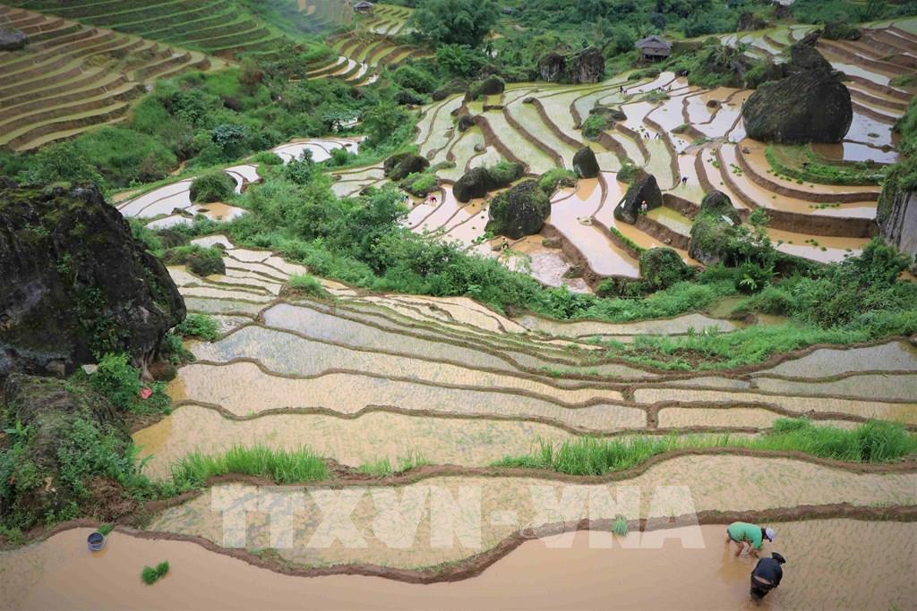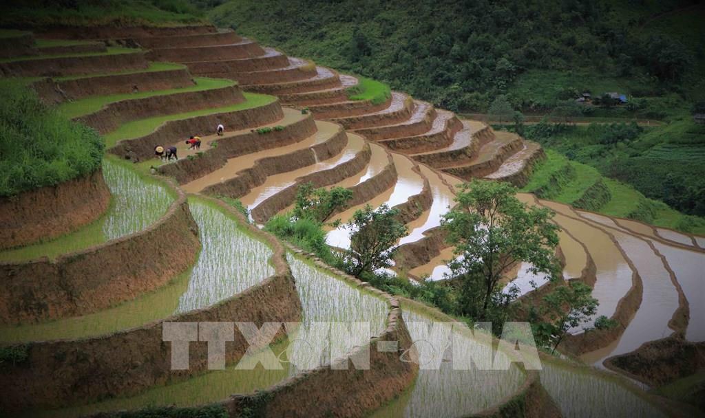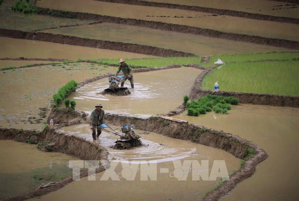 Nông dân làm đất cấy lúa khi nước đổ về ruộng bậc thang. Ảnh: Nguyễn Oanh-TTXVN