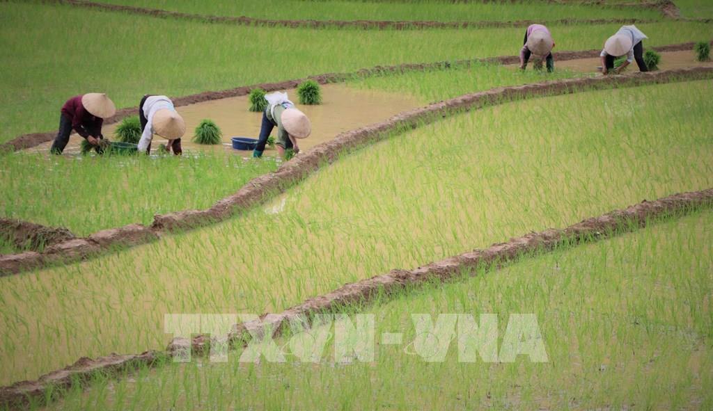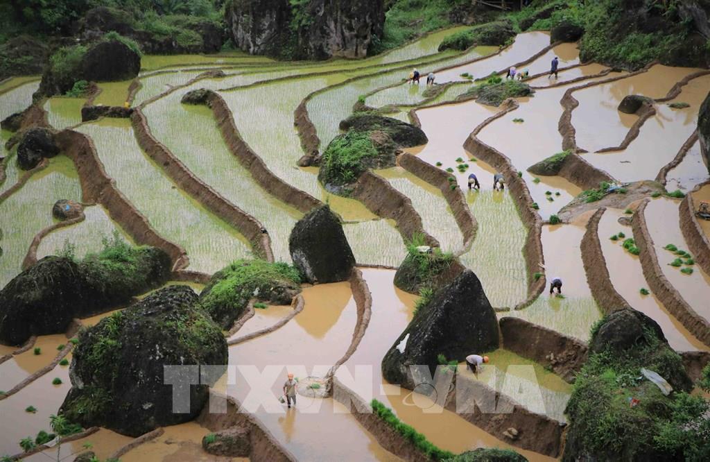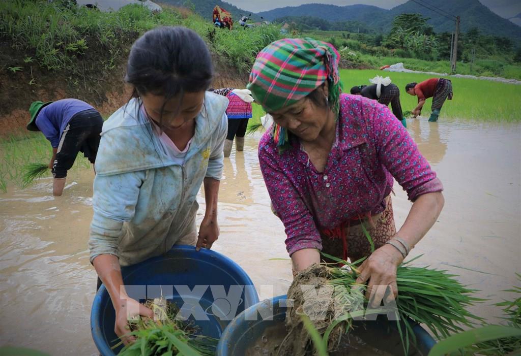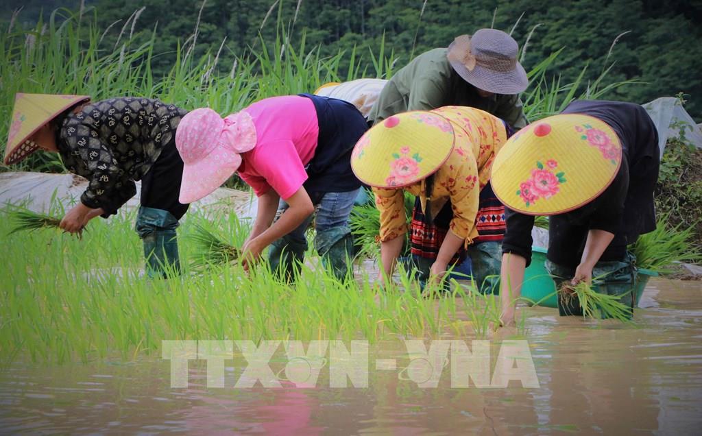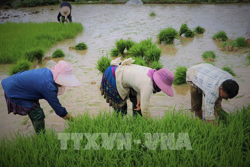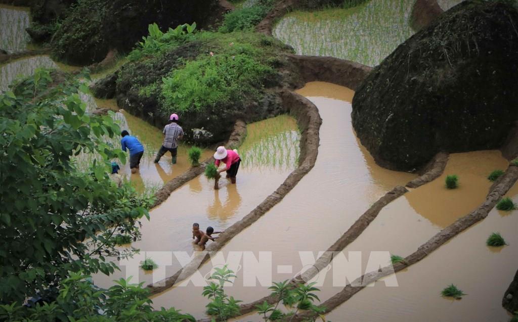 Đồng bào người Mông tất bật cấy lúa cho kịp thời vụ. Ảnh: Nguyễn Oanh-TTXVN