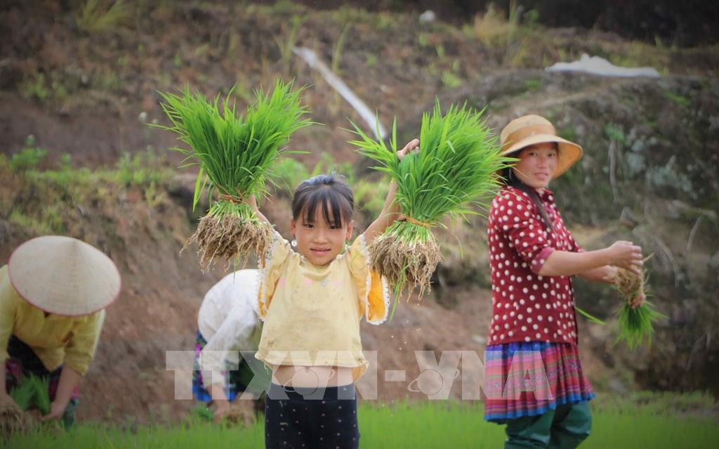 Trẻ em Mông theo mẹ lên ruộng bậc thang vào mùa cấy. Ảnh: Nguyễn Oanh-TTXVN