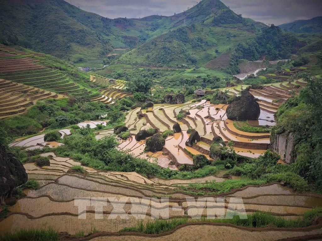 Những thửa ruộng bậc thang Khun Há, huyện Tam Đường, tỉnh Lai Châu vào mùa nước đổ. Ảnh: Nguyễn Oanh-TTXVN