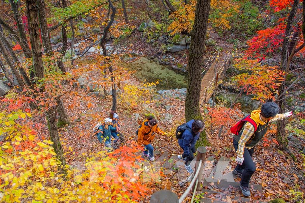 Du khách chiêm ngưỡng cảnh thu tại Cheongsong, tỉnh Bắc Gyeongsang, Hàn Quốc, ngày 29/10/2022. Ảnh: THX/ TTXVN