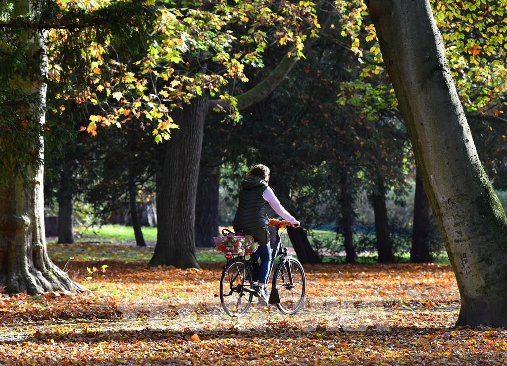 Người dân đạp xe trên thảm lá thu tại Berlin, Đức, ngày 28/10/2022. Ảnh: THX/ TTXVN