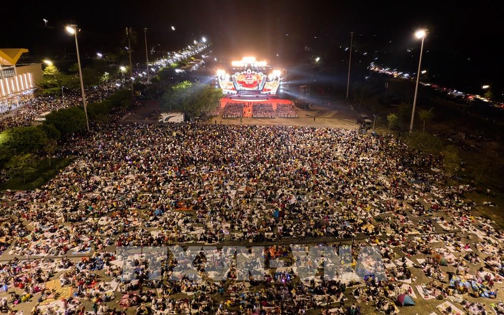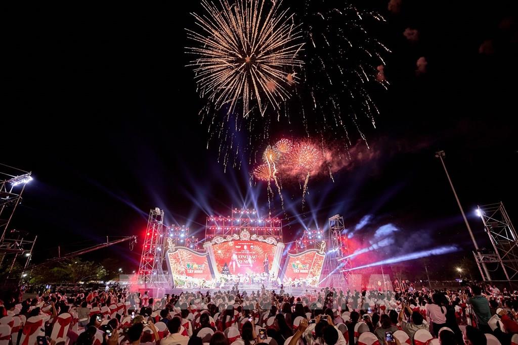 Đông đảo du khách trẩy hội, ngắm pháo hoa tại núi Bà Đen trong đêm khai mạc Lễ hội Xuân Núi Bà Đen Tây Ninh 2023 (Mùng 4 Tết). Ảnh: Thanh Tân - TTXVN