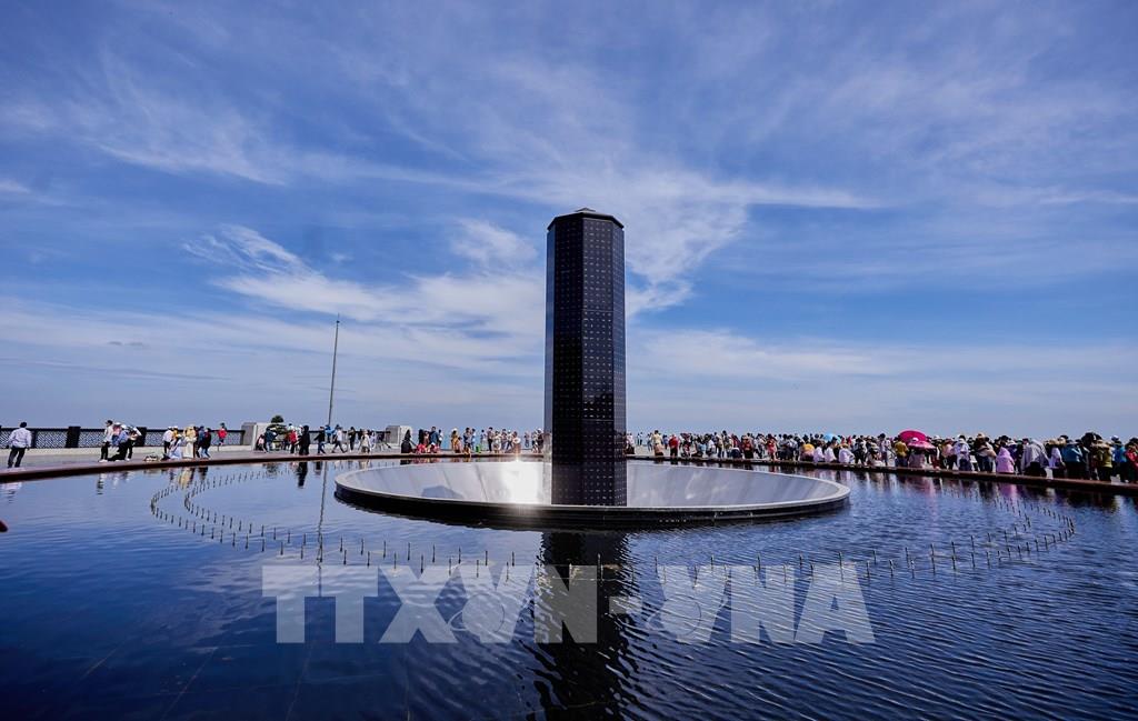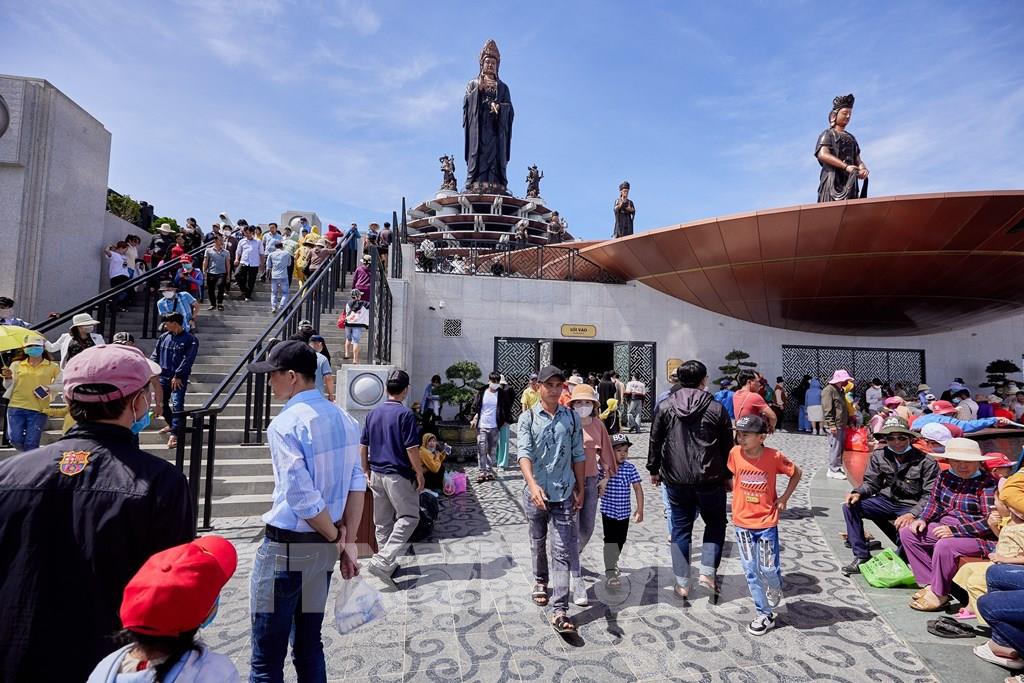 Du khách chiêm bái tượng phật Bà Tây Bổ Đà Sơn cao nhất châu Á trên đỉnh núi Bà Đen. Ảnh: Thanh Tân - TTXVN