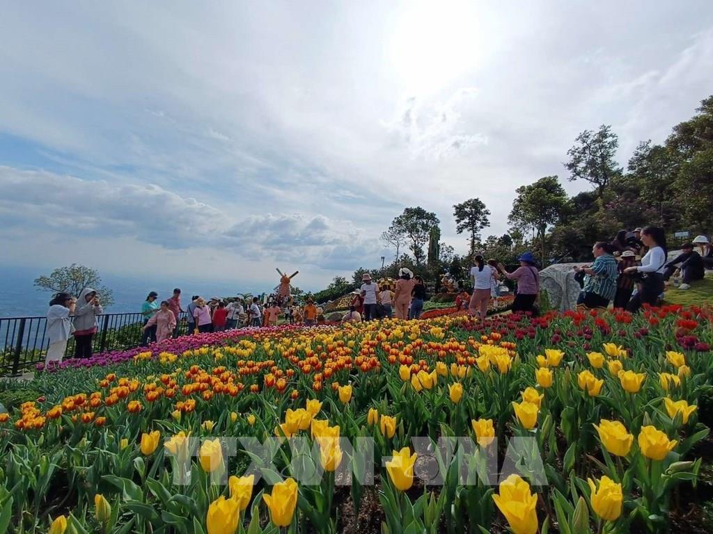 Hơn 100.000 cây hoa tulip trưng bày thành nhiều đợt tại đỉnh núi Bà Đen. Ảnh: Thanh Tân - TTXVN