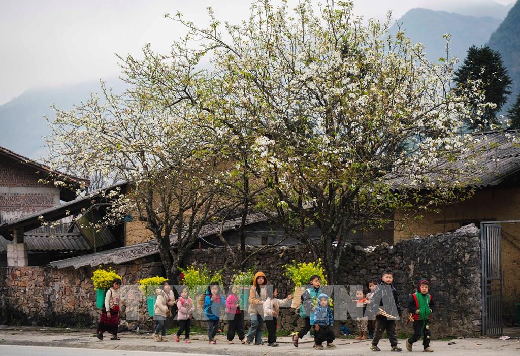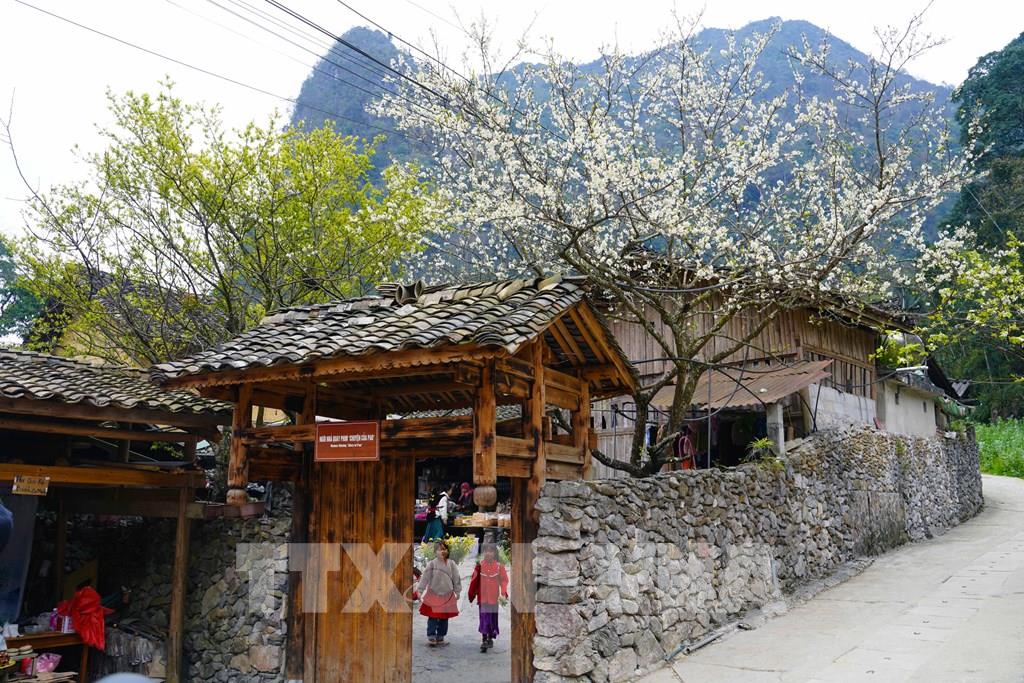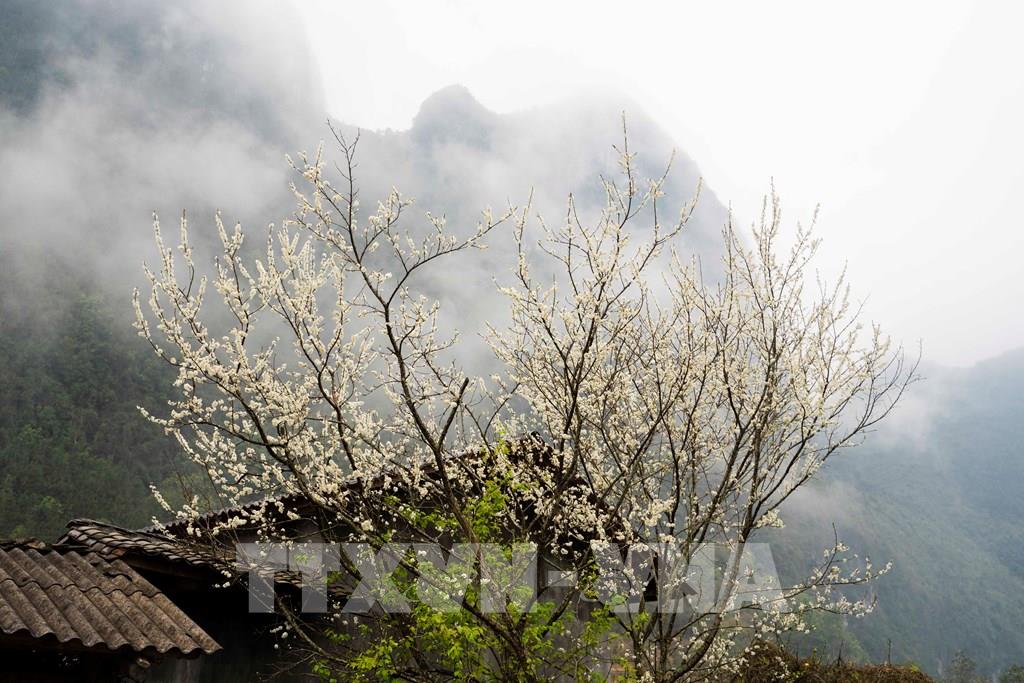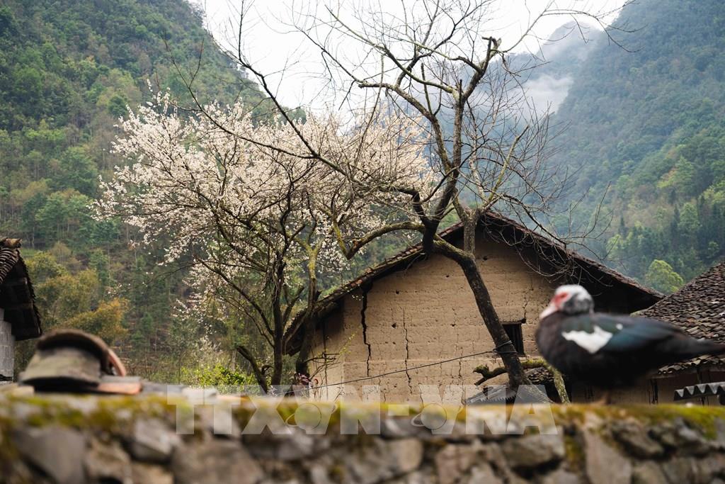 Hoa lê nở rộ bên những mái nhà trình tường ở xã Phố Cáo, huyện Đồng Văn, Hà Giang. Ảnh: Khánh Hoà - TTXVN