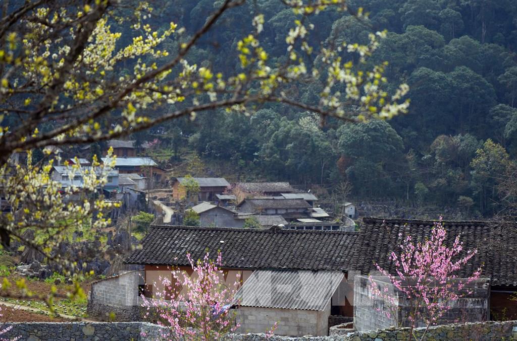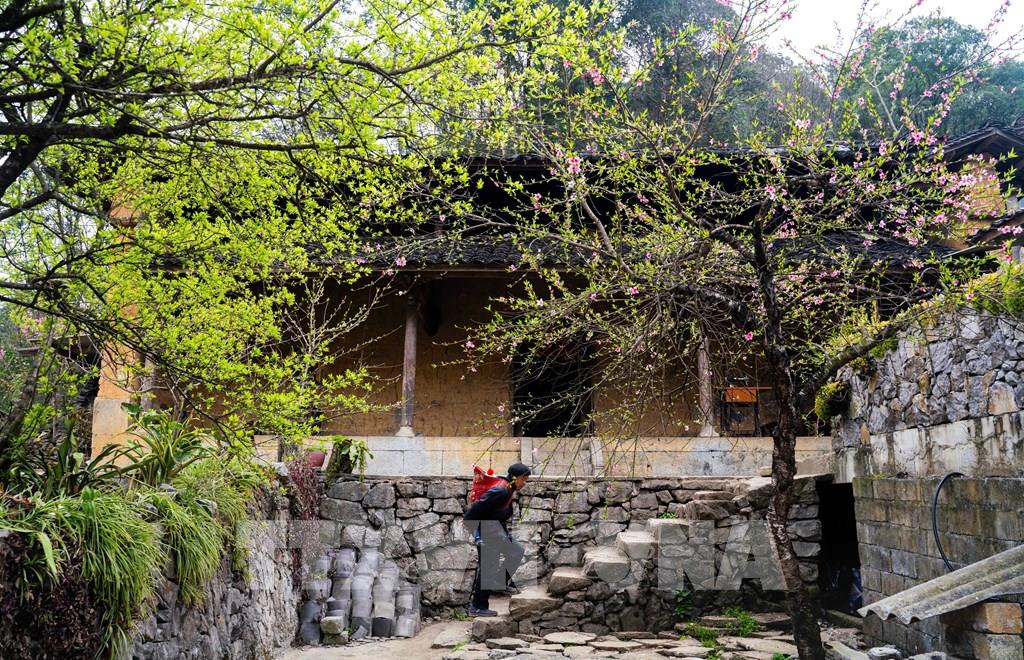 Sắc hoa đào tô điểm cho những ngôi nhà trình tường ở bản Lao Xa, xã Sủng Là, huyện Đồng Văn, Hà Giang. Ảnh: Khánh Hoà - TTXVN