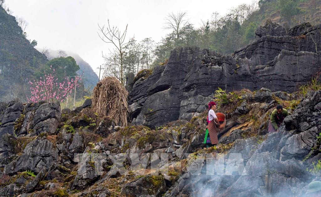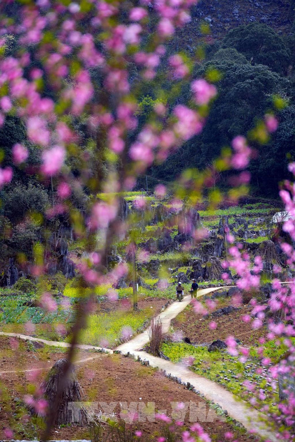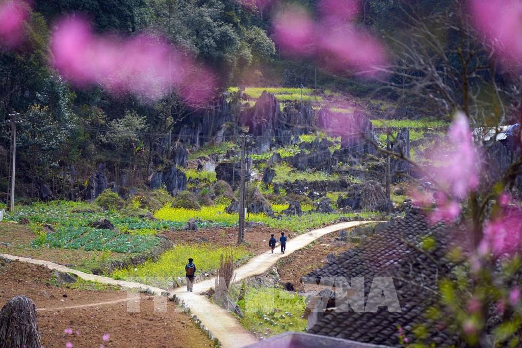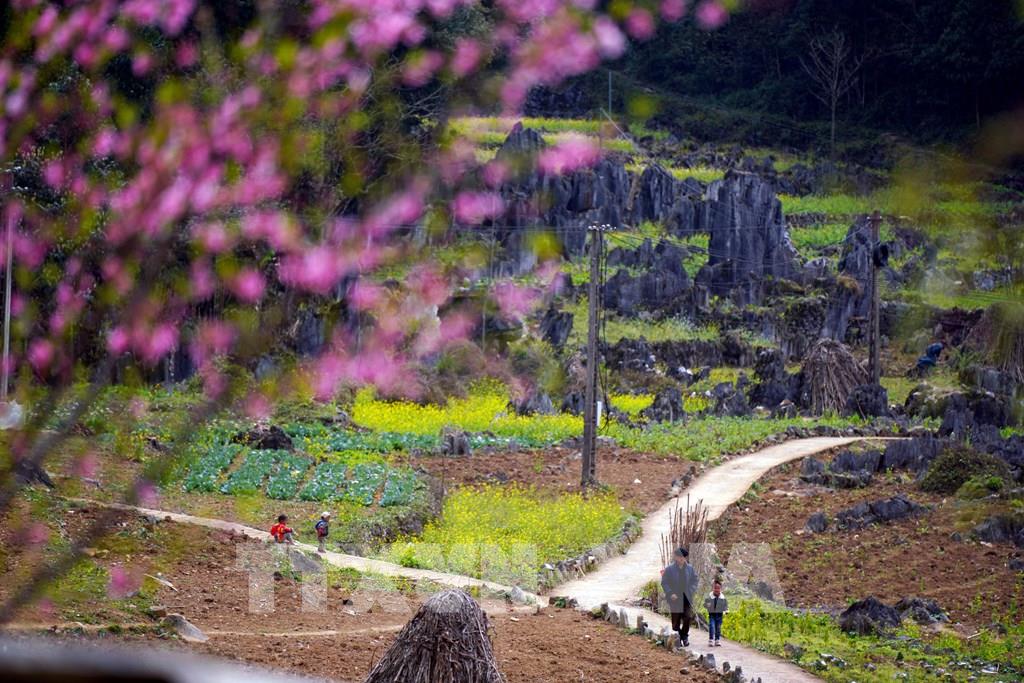 Sắc đào như tô điểm thêm cho cảnh sắc rực rỡ của cao nguyên đá Đồng Văn mỗi độ Xuân về. Ảnh: Khánh Hoà - TTXVN