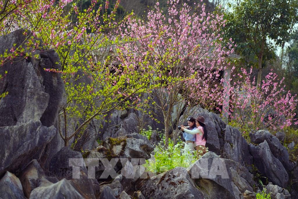 Khách du lịch thích thú ngắm nhìn cây đào nở rộ tại Lô Lô Chải, xã Lũng Cú, huyện Đồng Văn, Hà Giang. Ảnh: Khánh Hoà - TTXVN