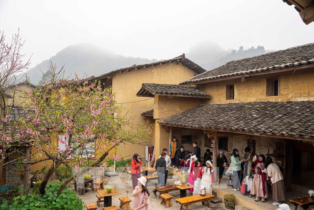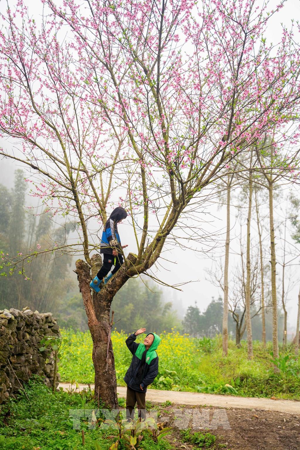 Những cây hoa đào nở rộ phần nào thu hút thêm khách du lịch đến với thôn Lô Lô Chải, xã Lũng Cú, huyện Đồng Văn, Hà Giang. Ảnh: Khánh Hoà - TTXVN