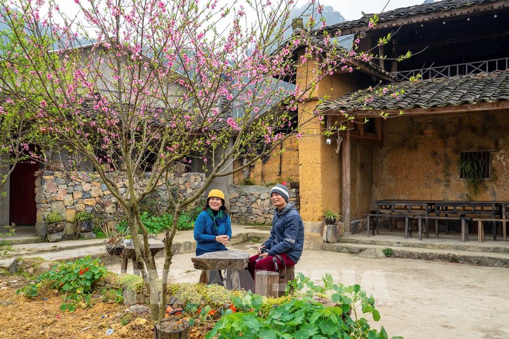 Hoa đào bung nở thu hút du khách tìm đến với bản Lao Xa, xã Sủng Là, huyện Đồng Văn, tỉnh Hà Giang. Ảnh: Khánh Hoà - TTXVN