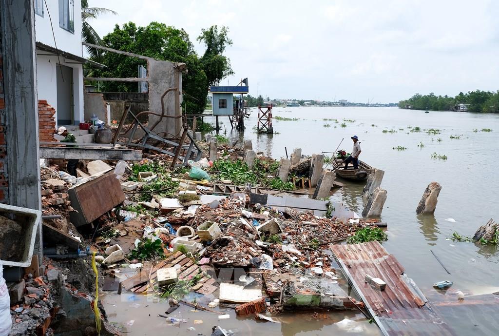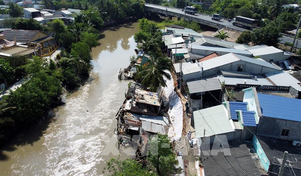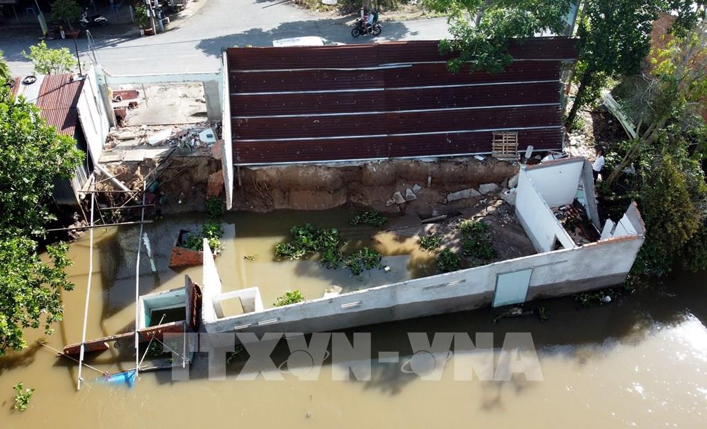 Sạt lở bờ sông Cần Thơ, khu vực ấp Mỹ Phước, xã Mỹ Khánh, huyện Phong Điền khiến phần nhà phía sau của 7 hộ dân bị sụp xuống sông, ước thiệt hại khoảng 10 tỷ đồng. Ảnh: Thanh Liêm - TTXVN