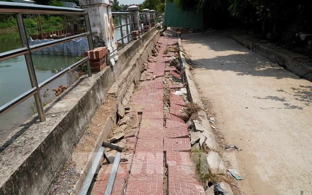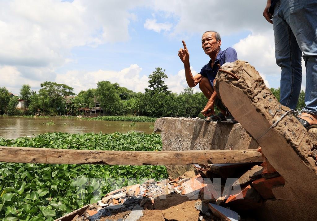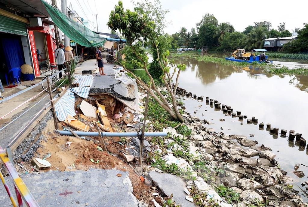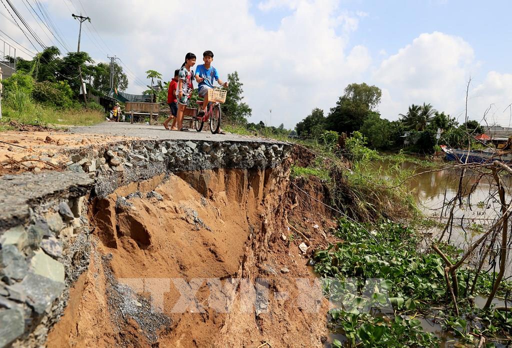 Sạt lở đường giao thông cặp sông Cần Lố, qua chợ trung tâm xã Nhị Mỹ, huyện Cao Lãnh, tỉnh Đồng Tháp. Ảnh: Hồng Đạt - TTXVN