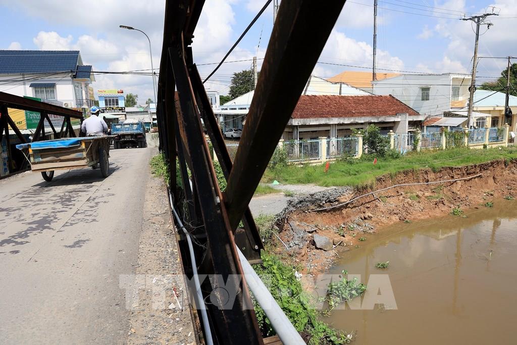 Cây cầu bắc qua sông Cần Lố, xã Nhị Mỹ, huyện Cao Lãnh, Đồng Tháp ngay sát điểm sạt lở. Ảnh: Hồng Đạt - TTXVN