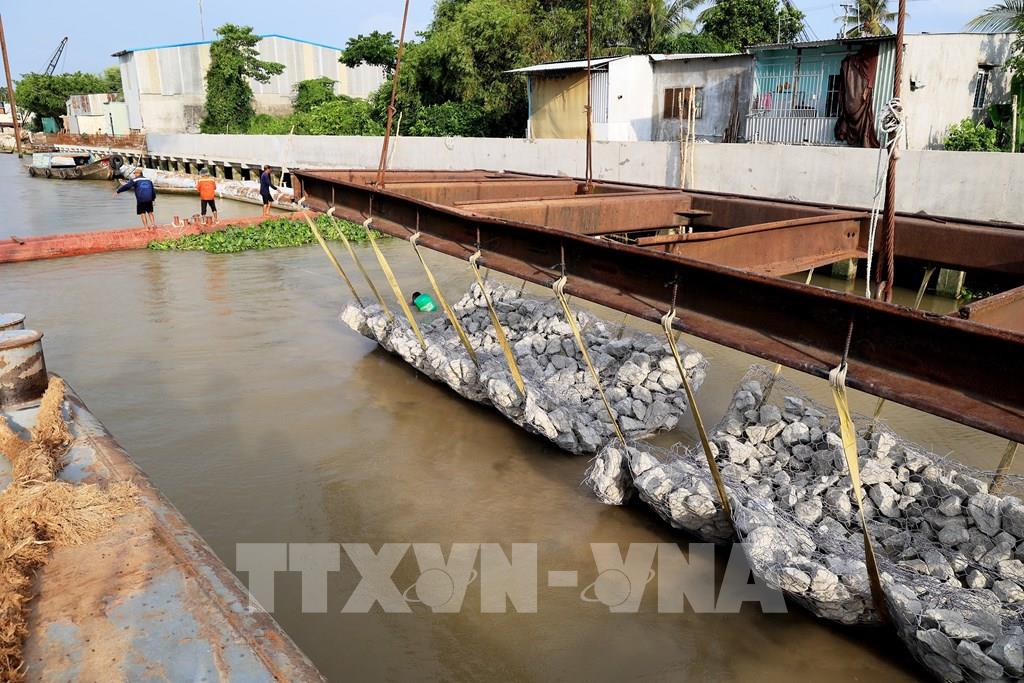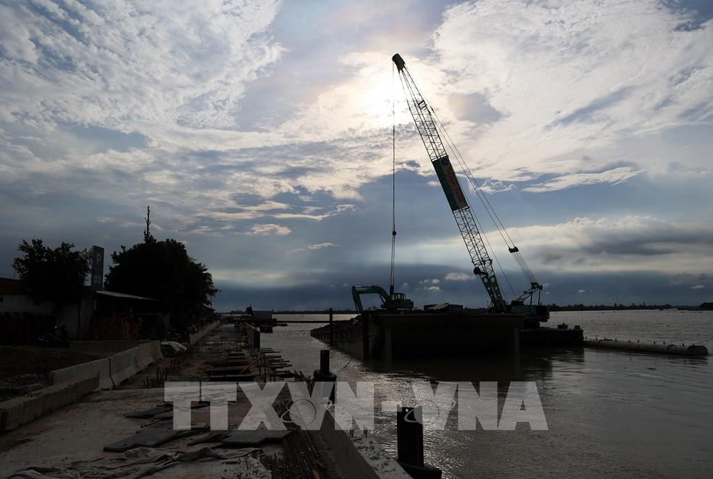 Thi công công trình chống sạt lở bờ sông Tiền, đoạn qua hai xã Tân Mỹ và Mỹ An Hưng B, huyện Lấp Vò, tỉnh Đồng Tháp. Ảnh: Hồng Đạt - TTXVN
