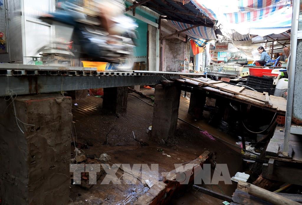 Cây cầu sắt tạm thay con đường bị sạt lở, sụt lún chạy trong chợ Tân Tiến, gặp trời mưa trơn trượt khiến nhiều xe máy, người dân đi lại bị té ngã. Ảnh: Hồng Đạt - TTXVN