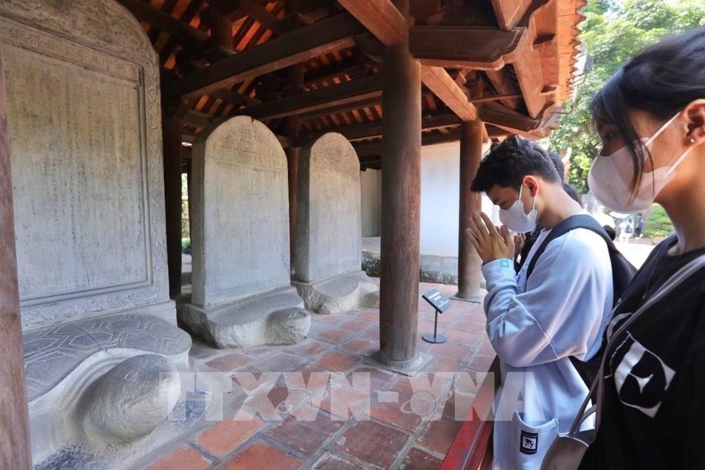 Càng gần đến ngày diễn ra Kỳ thi tuyển sinh lớp 10 THPT, lượng sĩ tử đến Khu di tích quốc gia đặc biệt Văn Miếu – Quốc tử giám tăng đột biến. Ảnh: Hoàng Hiếu - TTXVN