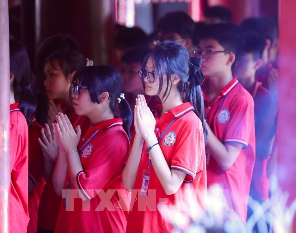 Học sinh Khối lớp 9 Trường THCS Cổ Loa (Đông Anh, Hà Nội) khấn cầu tại Khu di tích quốc gia đặc biệt Văn Miếu – Quốc tử giám. Ảnh: Hoàng Hiếu - TTXVN