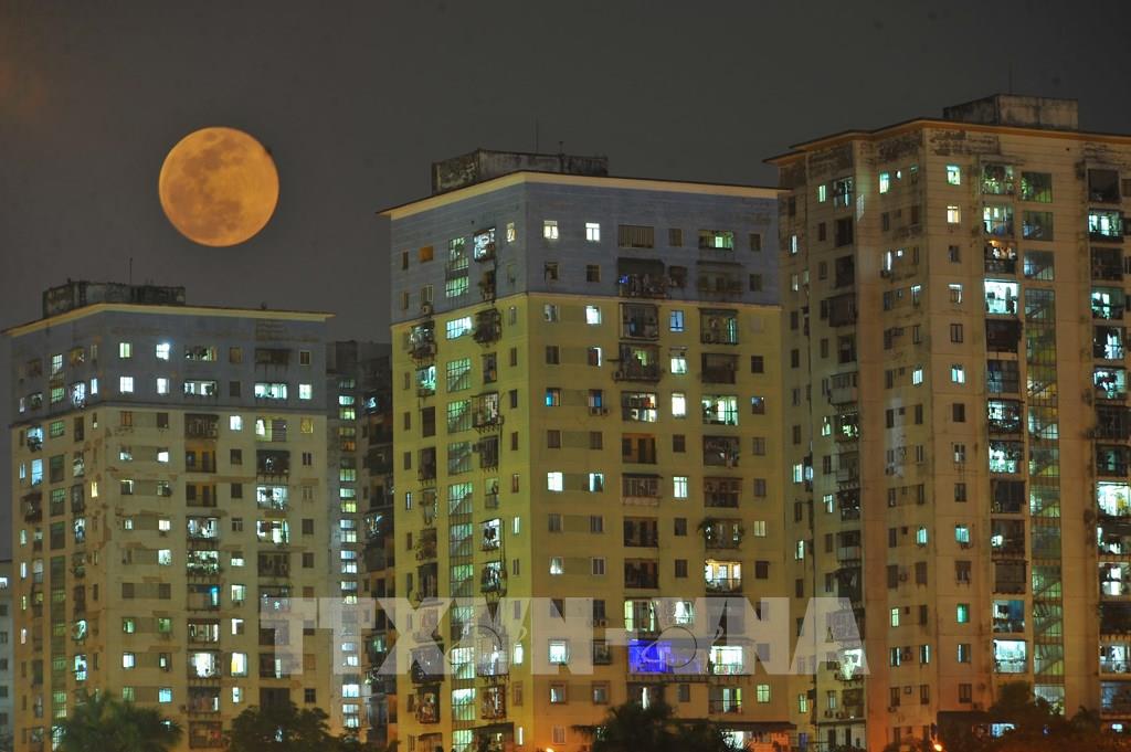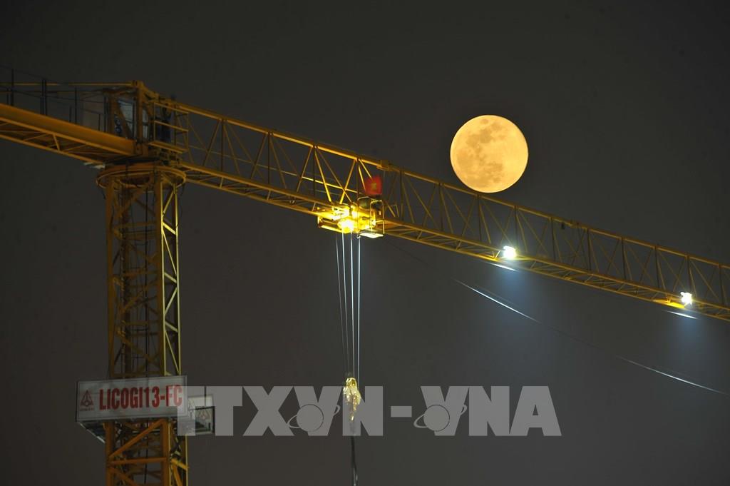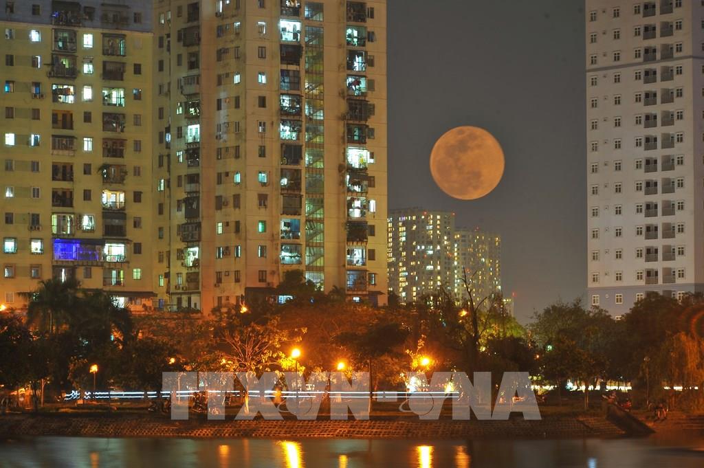 Siêu trăng là hiện tượng trăng tròn đúng lúc nằm ở vị trí gần Trái đất nhất trong quỹ đạo hình elip, dẫn tới việc mặt trăng trông to và sáng hơn thường lệ. Ảnh: Minh Đức - TTXVN