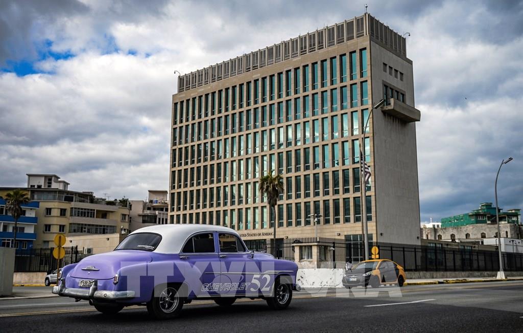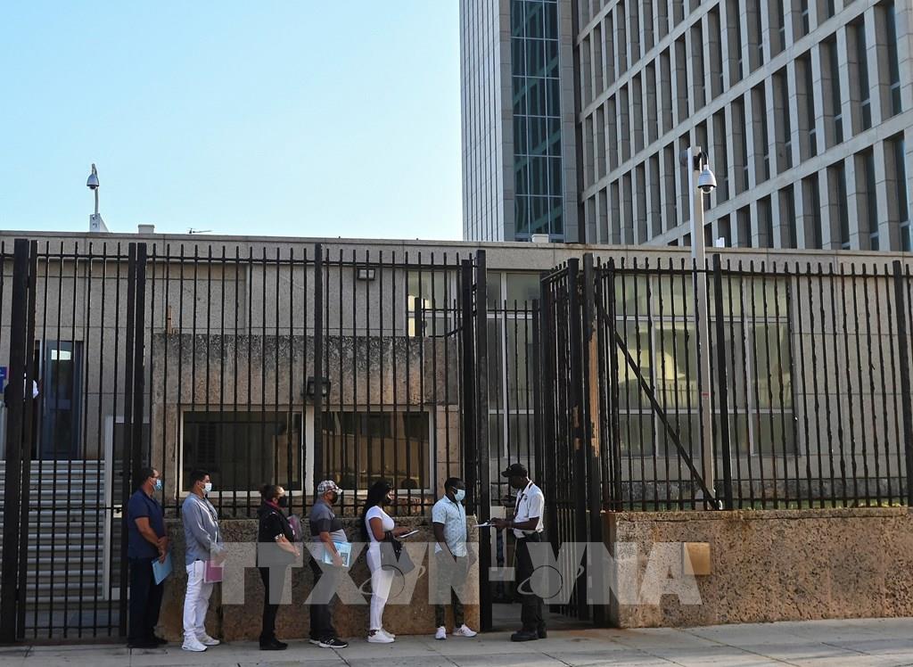 Ngày 21/9/2022, Đại sứ quán Mỹ tại Cuba thông báo Mỹ sẽ nối hoàn toàn lại việc xét duyệt thị thực nhập cảnh tại Cuba vào năm tới. Thông báo nêu rõ sự thay đổi này sẽ không đòi hỏi người dân Cuba phải qua nước khác để xin phỏng vấn thị thực. Trong ảnh (tư liệu): Đại sứ quán Mỹ tại La Habana, Cuba, ngày 3/5/2022. Ảnh: AFP/ TTXVN